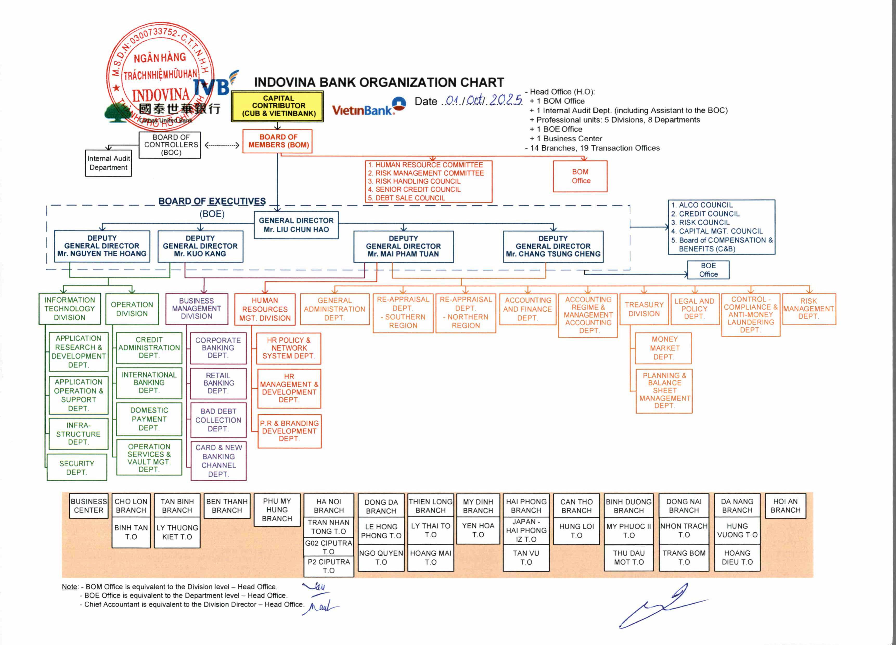 Indovina Bank Ltd. (IVB) is Vietnam’s first joint-venture bank established on 21 November 1990, under Investment License No. 135/GP issued by the State Committee for Cooperation, Business License No. 08/NH-GP dated 29 October 1992 issued by the State Bank of Vietnam. Currently, SBV has approved for IVB’s Business license amendment to license no. 101/GP-NHNN dated 11 November 2019. The joint-venture partners are Vietnam Joint Stock Commercial Bank for Industry and Trade (Vietinbank) and Cathay United Bank in Taiwan (CUB). Equally contributed by the two shareholders, IVB’s chartered capital was USD193 million at the end of 2024.